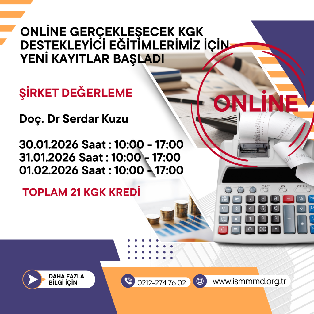 | 30.Oca.26 | 10:00 – 17:00 | ŞİRKET DEĞERLEME | 7 | DOÇ. DR. SERDAR KUZU | UZAKTAN |
